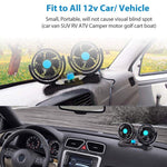CCE-12V Electric Car Fan 360 Degree Rotatable Dual Head 2 Speed Quiet Strong Dashboard Auto Cooling Air Fan for All Auto Vehicles Specification: - Power: 8W - Voltage: DC 12V - Attached cable length: Approx 1.33m/5.4ft - Noise: Less than 50dB, low noise - Fan Size: 4 inch Diameter 5 PCS ABS Fan - Input Power: 12V Cigarette Lighter Socket Features: - Low power consumption, super energy-saving and environmentally friendly - Equipped with a cigarette lighter plug, no more extra batteries required - Small sized and lightweight, portable and easy to carry - Refresh the strange odor in your car - Ideal for cars, trucks, buses, off-road equipment, boats and other recreational vehicles Package Included: 1 x Catinbow 12V Car Fan 2 x Catinbow Adhesive Pads
